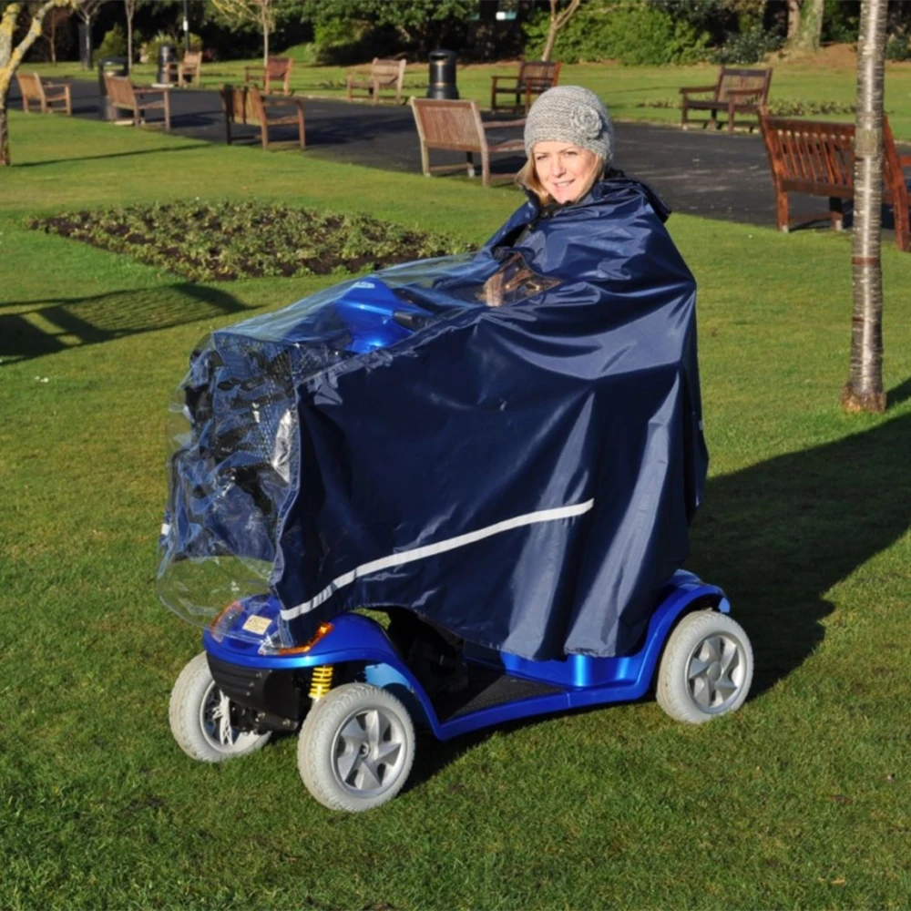 The Scooter Cape is a highly practical aid that covers you and your scooter to help protect you from the wind and rain. The soft clear panel at the front allows you to see your controls and also allows cars and other pedestrians to see your lights. If your scooter features wing mirrors there is a velcro slot at either side for them to fit through to ensure you have maximum visibility when using your mobility scooter. To help when getting on and off your scooter the cape has a full length side zip that opens at the bottom so you can place it over your scooter and then step in. Reflective strips at the side and the rear ensure that you can be seen at night from all angles.