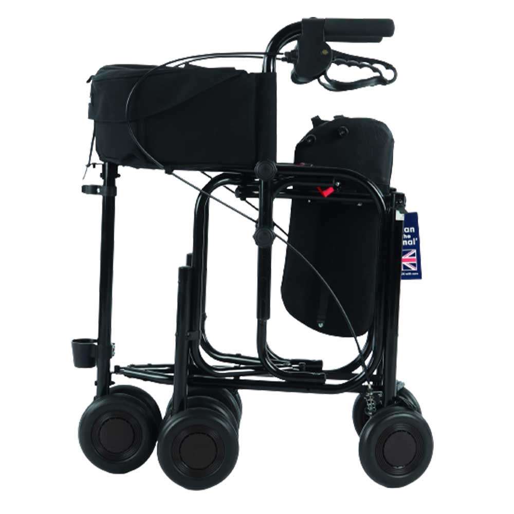 The Uniscan Triumph Plus Tri-Walker is designed for users who like the look of a 3-legged walker but need additional stability. It has all the features of the Triumph, but with two extra legs. The walker has a rest seat, a tray with a cover, a stroller and a shopping bag. The Rollator also has a locking lever cable, they work just like a bicycle to “slow down” the walker, but also have a “parking brake” if the user wants to rest. Uniscan Triumph Plus includes an adjustable handle. There are settings that can be adjusted in 1.5 inch (38 mm) increments. The first setting is 10.5 inches (267 mm) above seat height. We recommend that the height of the handle be at the height of the user’s wrist when standing and walking.