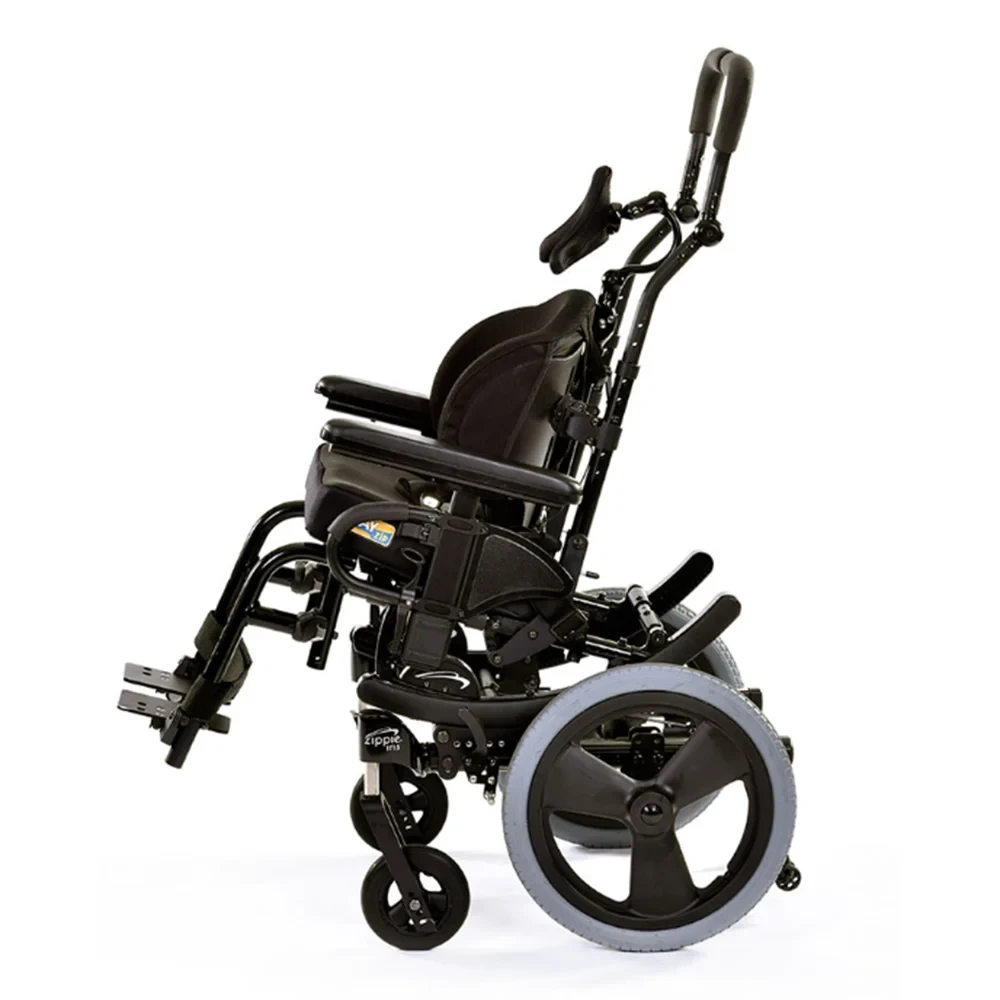 The Zippie RS Rotation-in-Space wheelchair is designed for a variety of positioning needs focused on facilitating feeding and respiratory function, reducing pressure beneath the pelvis and improving visual orientation. The Zippie RS allows easy positioning and re-positioning to reduce the time in a single position. This is necessary for a child who cannot do a functional independant weight shift consistently.